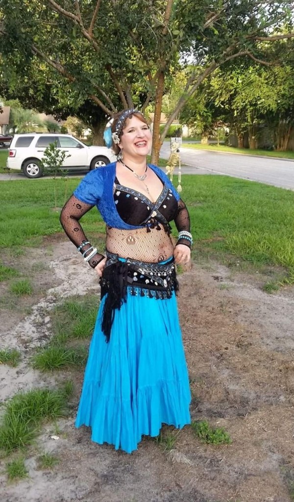 It all started with belly dancing. I took classes with my sister and spent a ton of money on ill fitting costumes. I am extremely well endowed making it difficult to find anything that comes in sets fit me. So the simple fix was to make my own. You can see from my very first costume, we were performing more cabaret style dances.